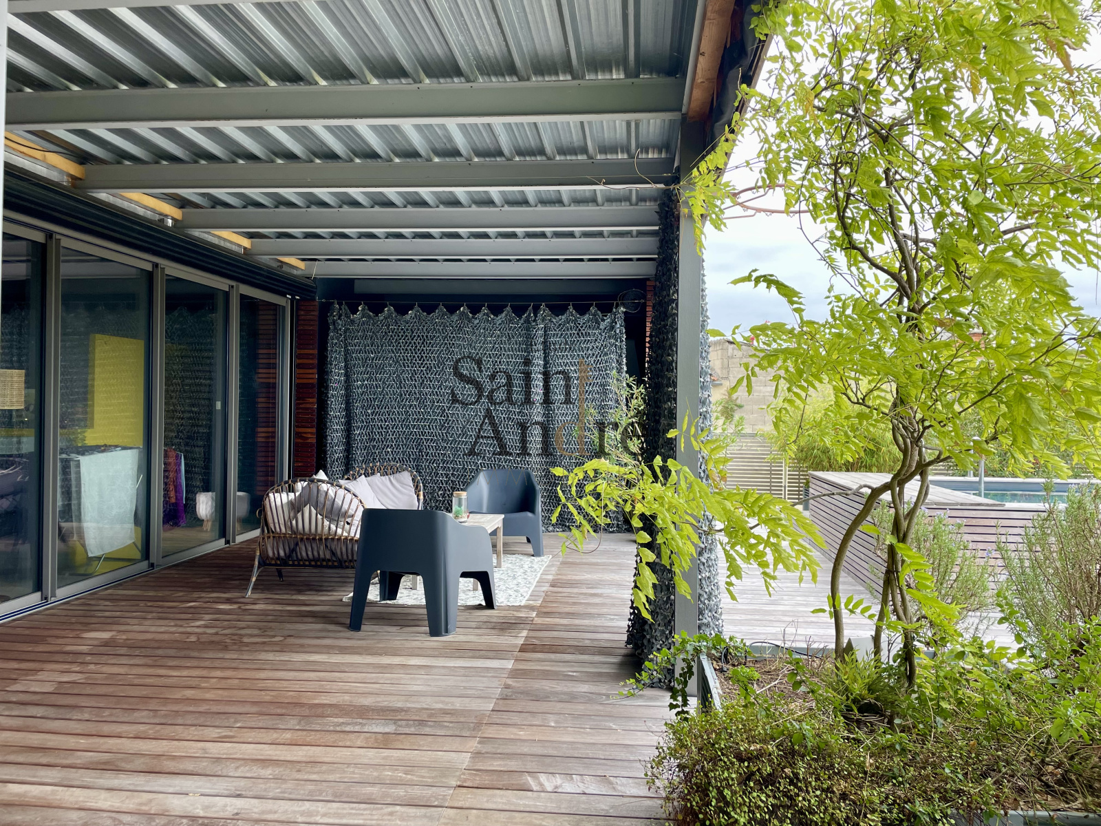 La terrasse paysagée, véritable jardin suspendu, accueille plusieurs espaces de détente ainsi qu’une piscine sur le toit, rareté absolue dans ce secteur.