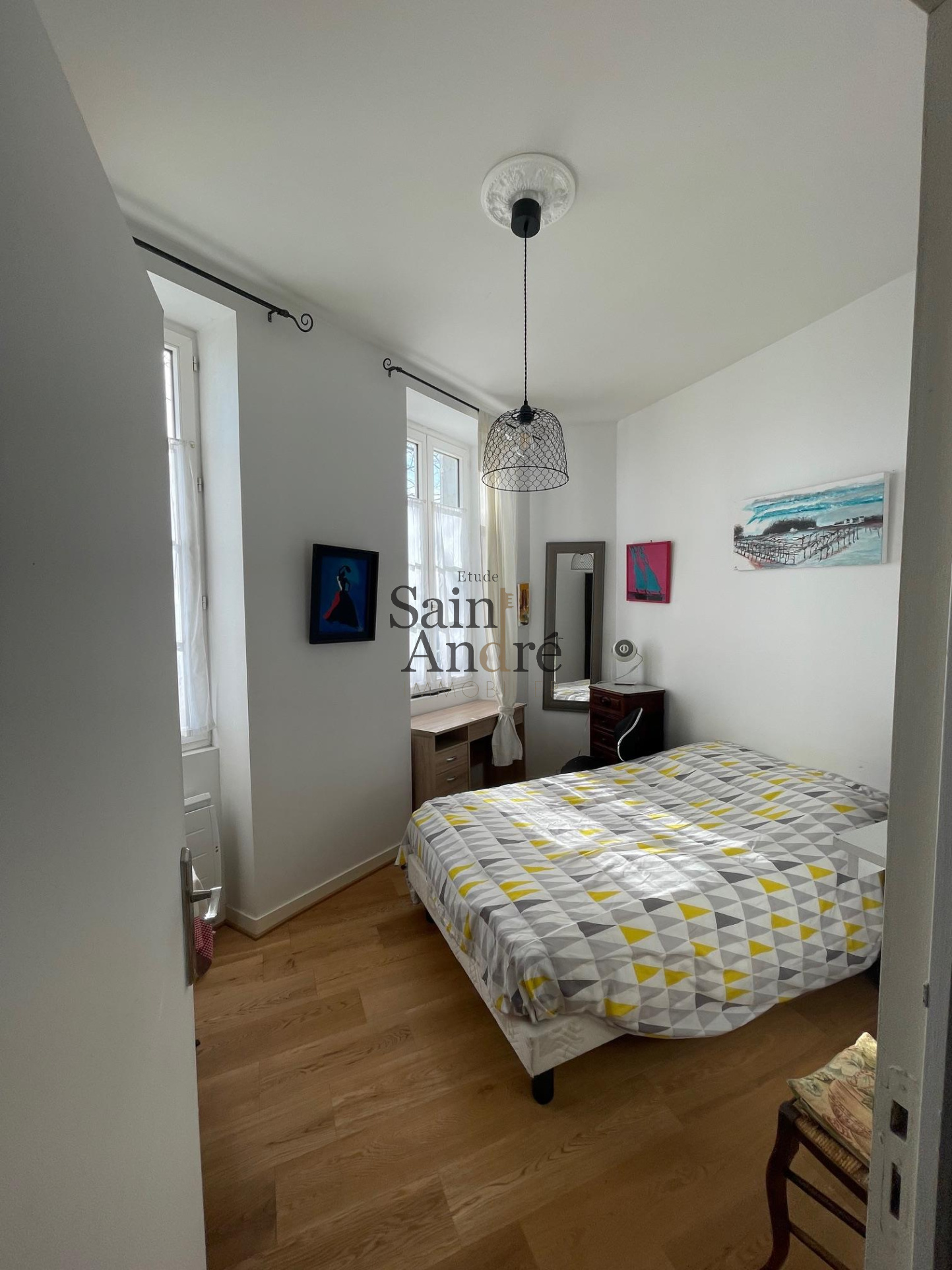 Au rez-de-chaussée, vous découvrirez un hall d’entrée accueillant, deux chambres lumineuses, une salle d’eau, des toilettes séparées ainsi qu’un espace buanderie pratique.