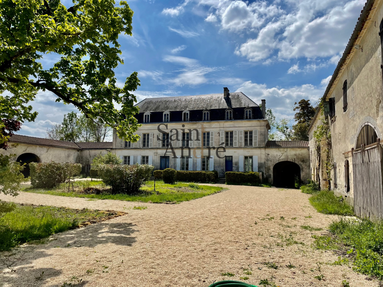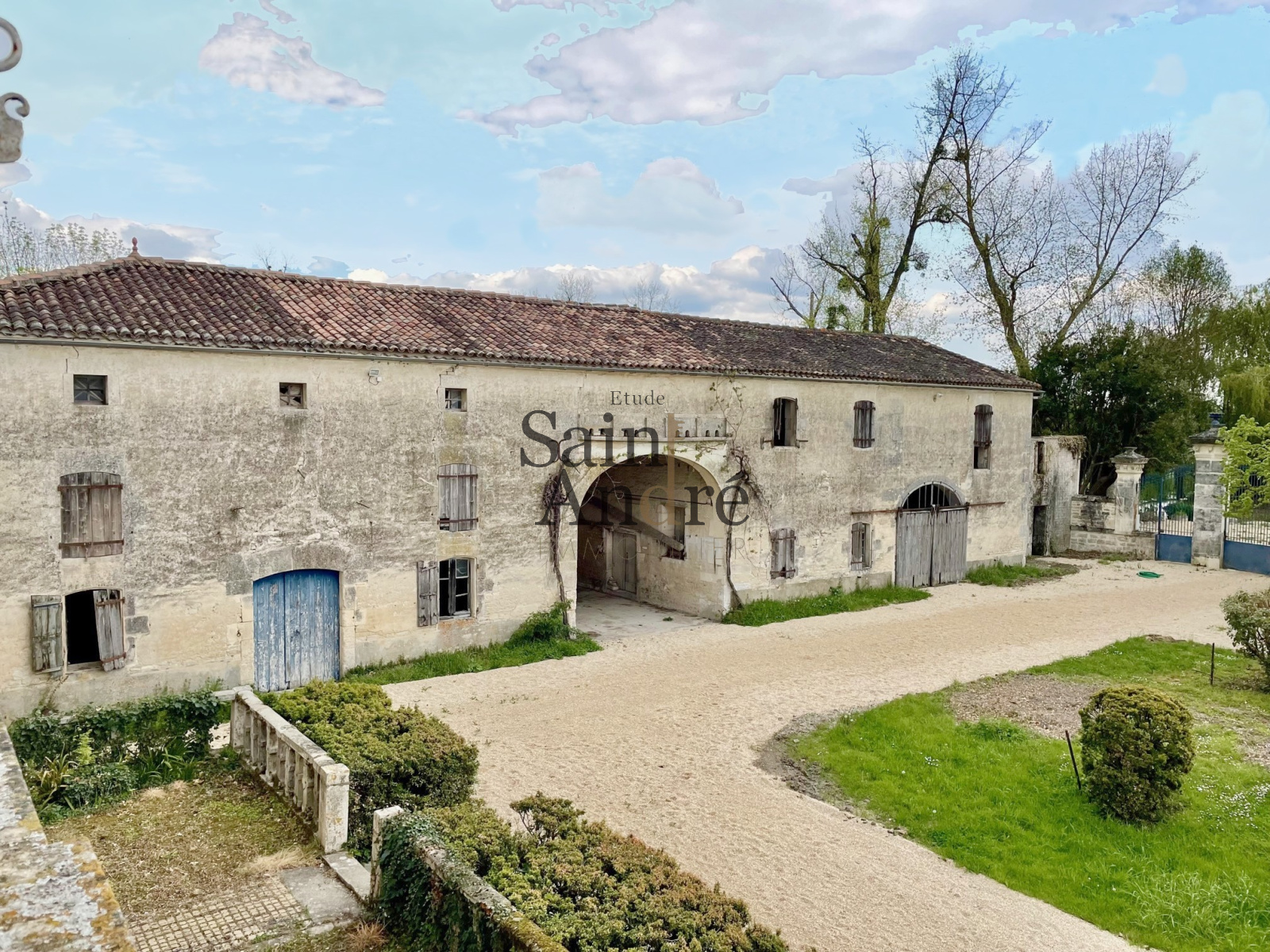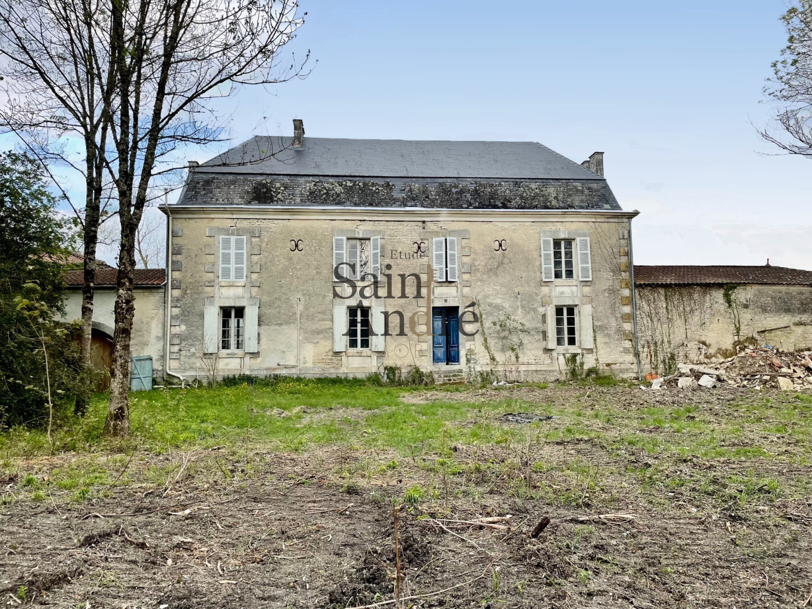 Belle demeure du XIXe ayant besoin d'une rénovation complète. Env. 300 m² de maison principale avec possibilité d'avoir 8/9 pièces. La cour d'honneur est fermée par de vastes dépendances. La propriété comprend env. 1.6 hectare de terrain bordé par un petit cours d'eau. Ensemble calme et très bucolique à l'entrée d'un petit village situé entre les petites villes de Rouillac et Jarnac.