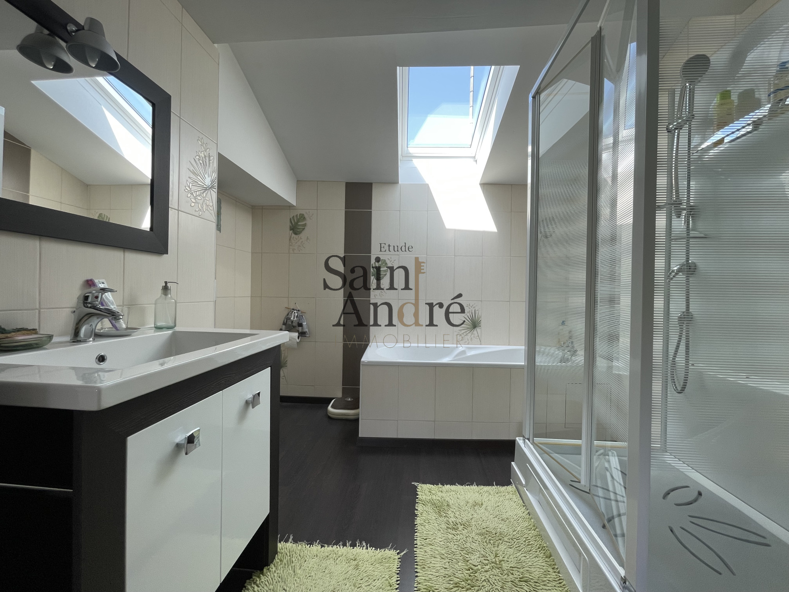 Au rez-de-chaussée, vous découvrirez un vaste hall d’entrée, un salon chaleureux, une cuisine aménagée et équipée, un séjour lumineux, une buanderie ainsi qu’un WC indépendant.
