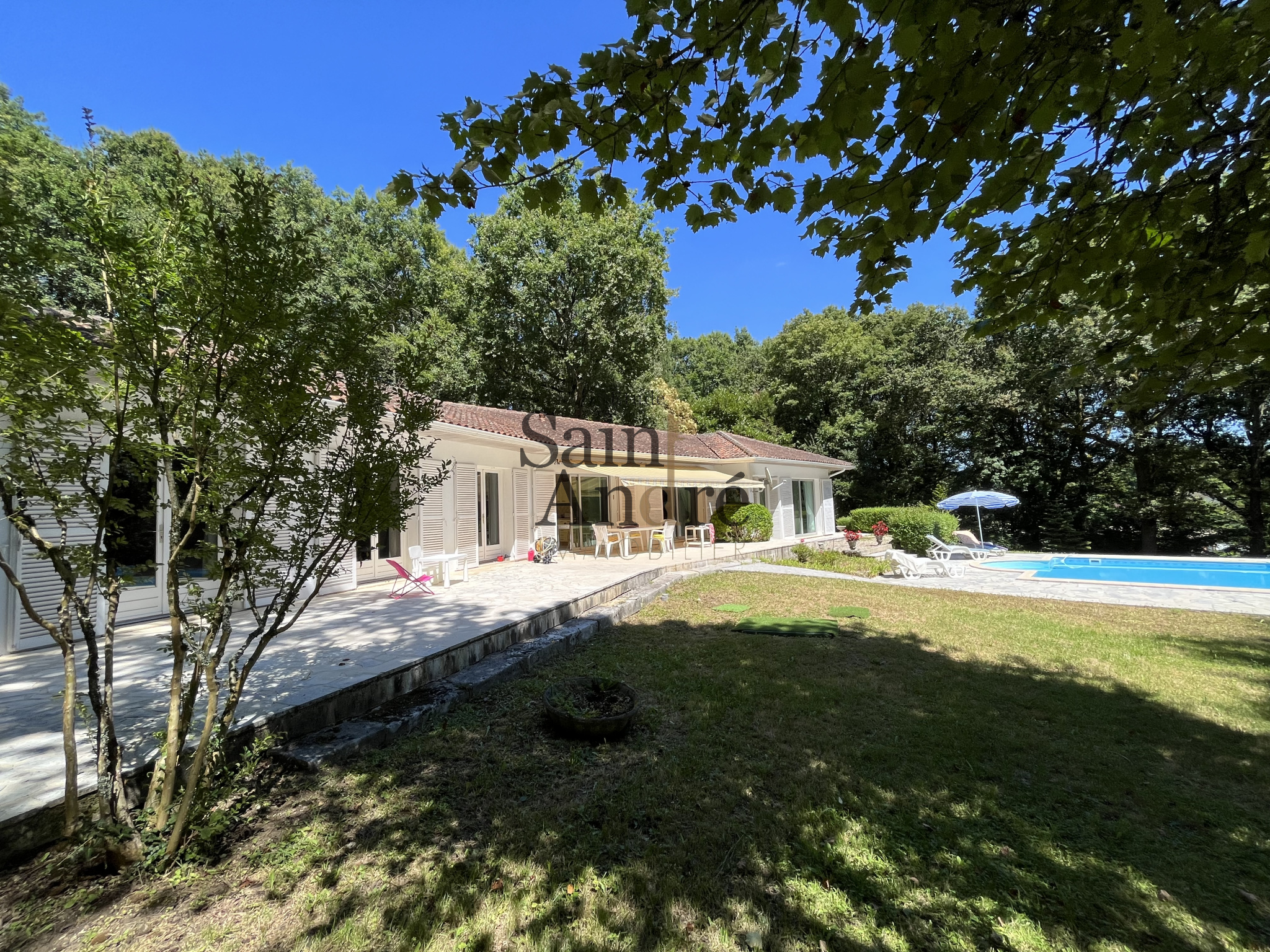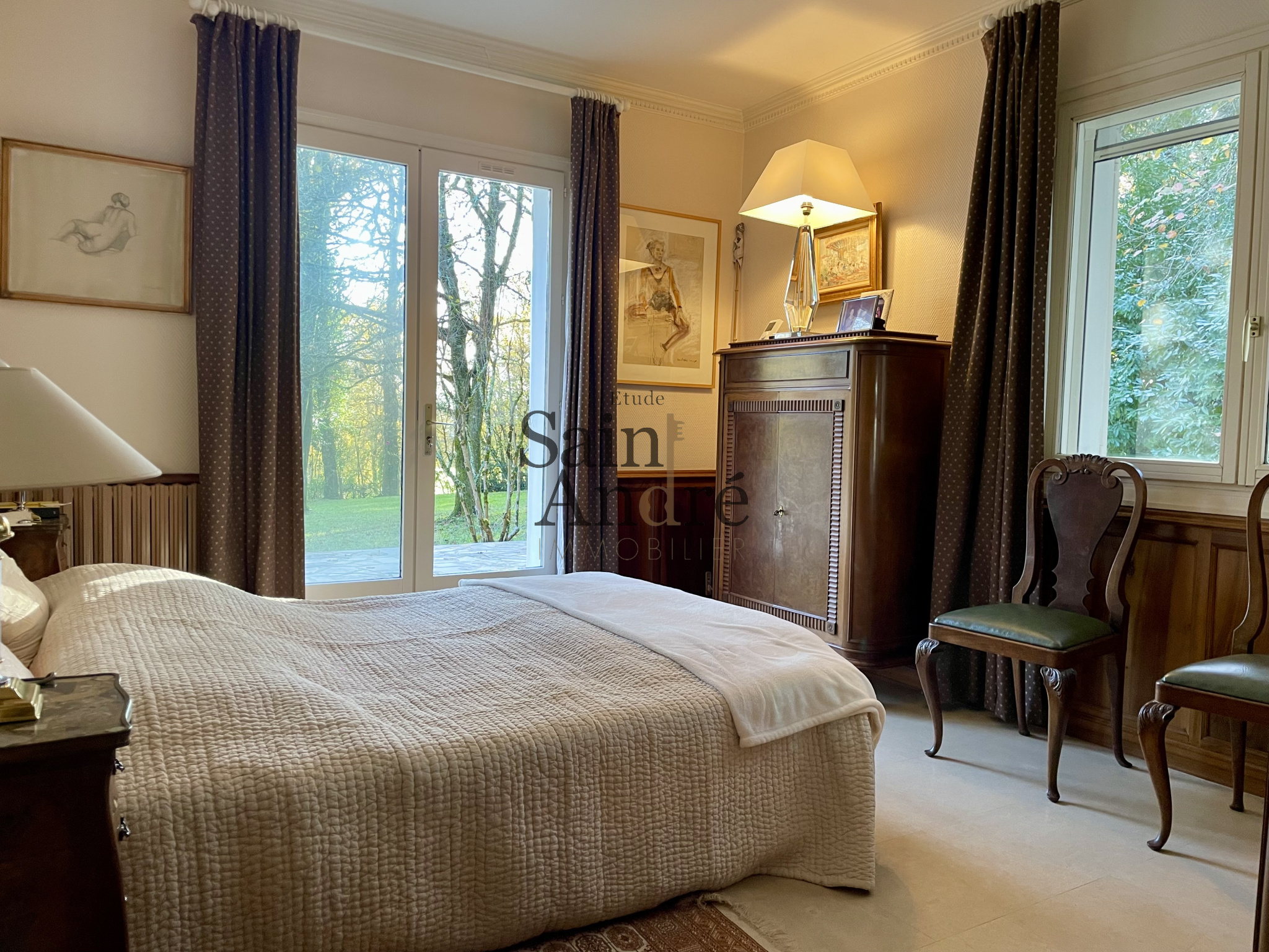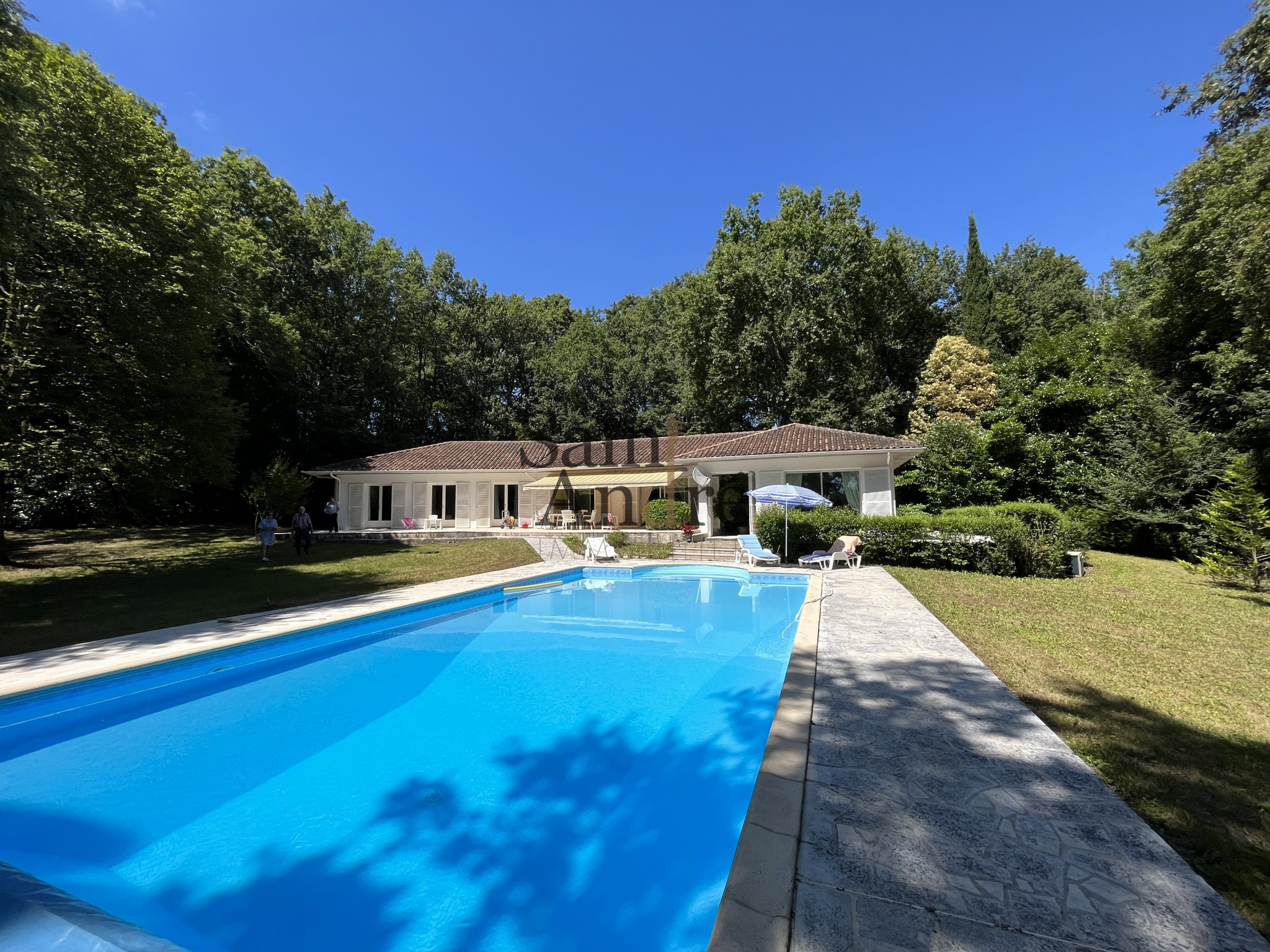 En interieur : Le Hall d'entrée paré de boiseries, s'ouvre sur un séjour exceptionnel d’environ 70 m², bénéficiant d’accès directs à une grande terrasse dominant la piscine chauffée (6 × 12 m) et offrant une vue dégagée sur les prairies et les bois environnants, 4chambres + 1 Suite principale ave SDB & dressing.