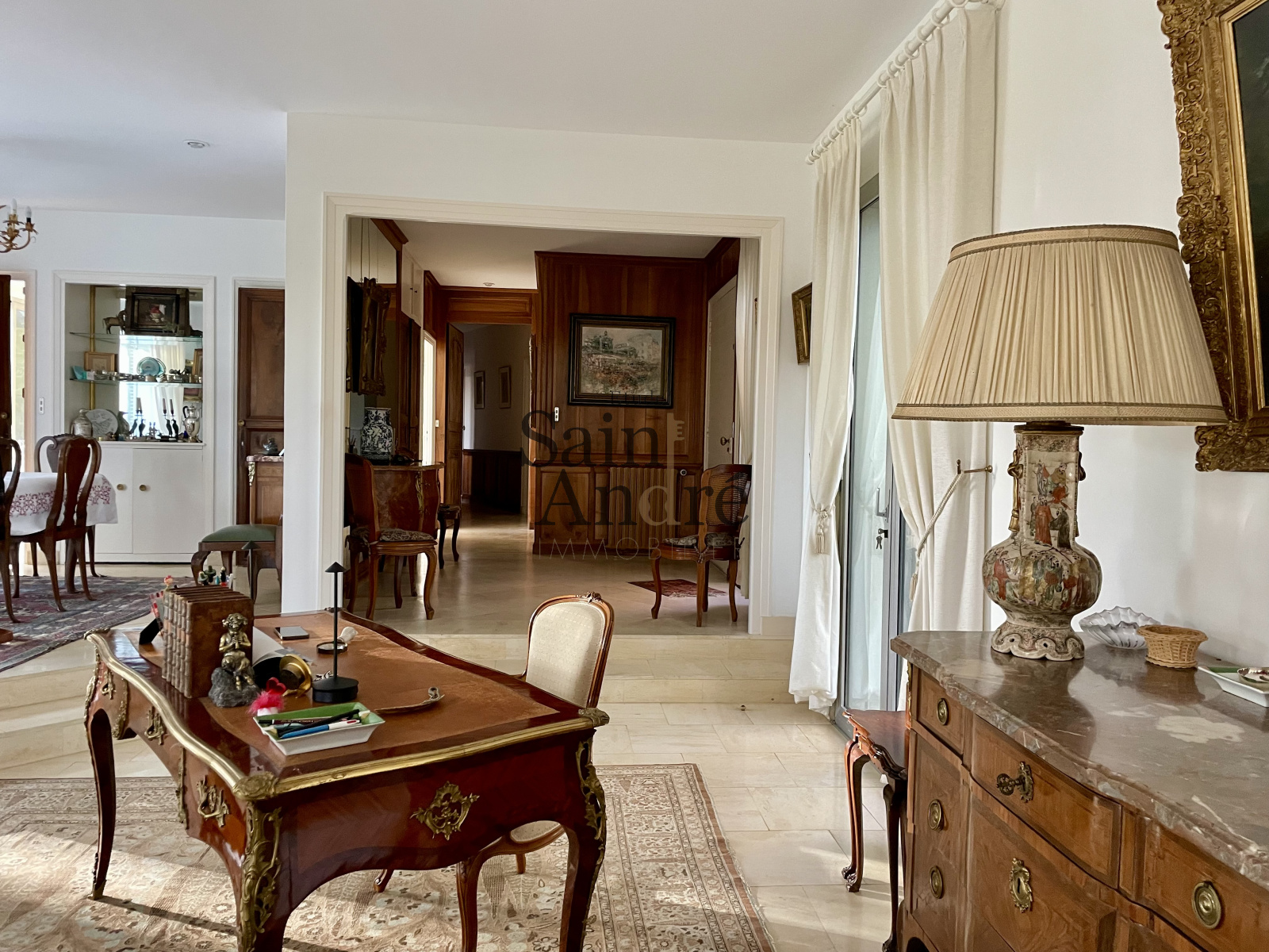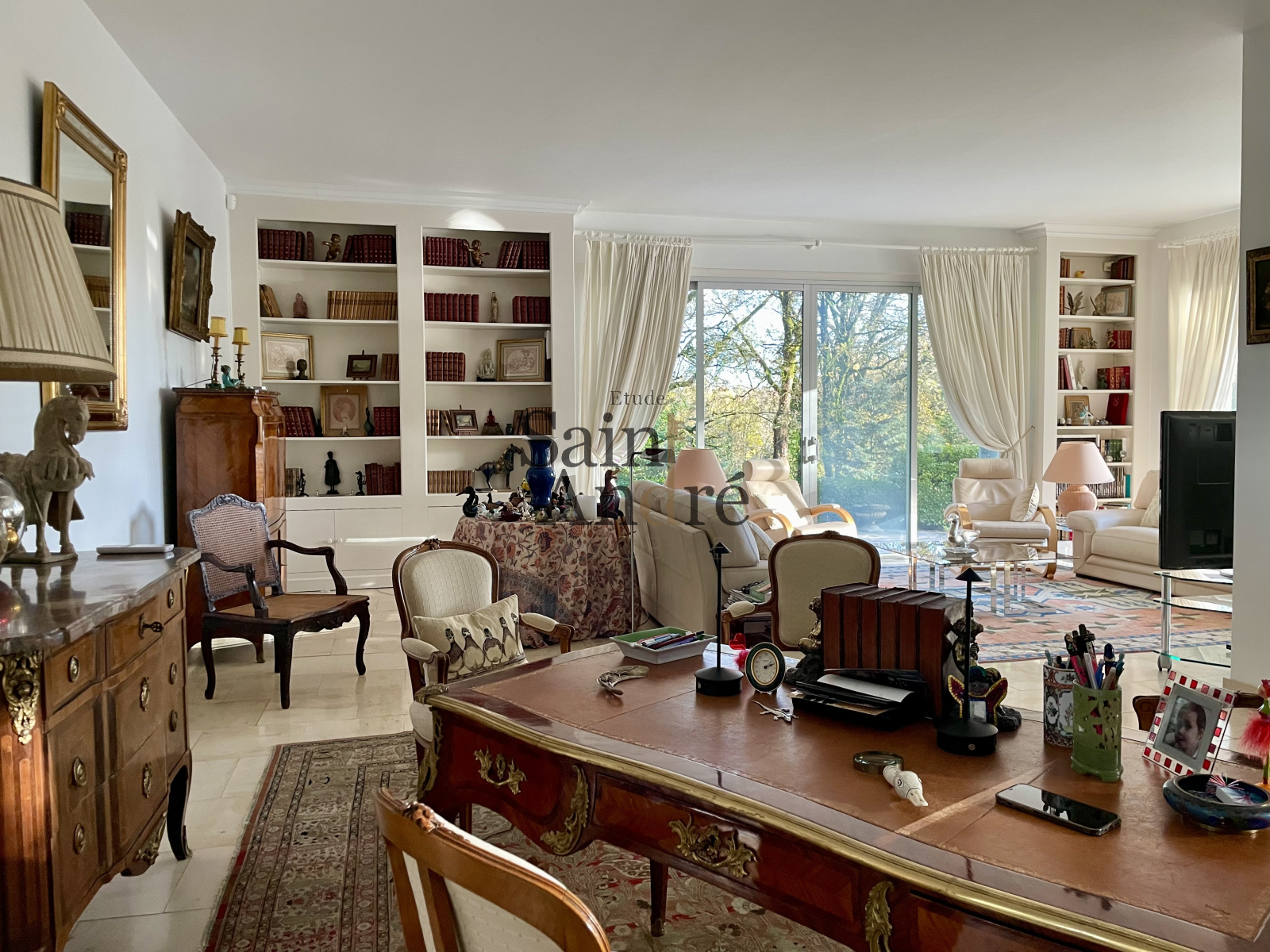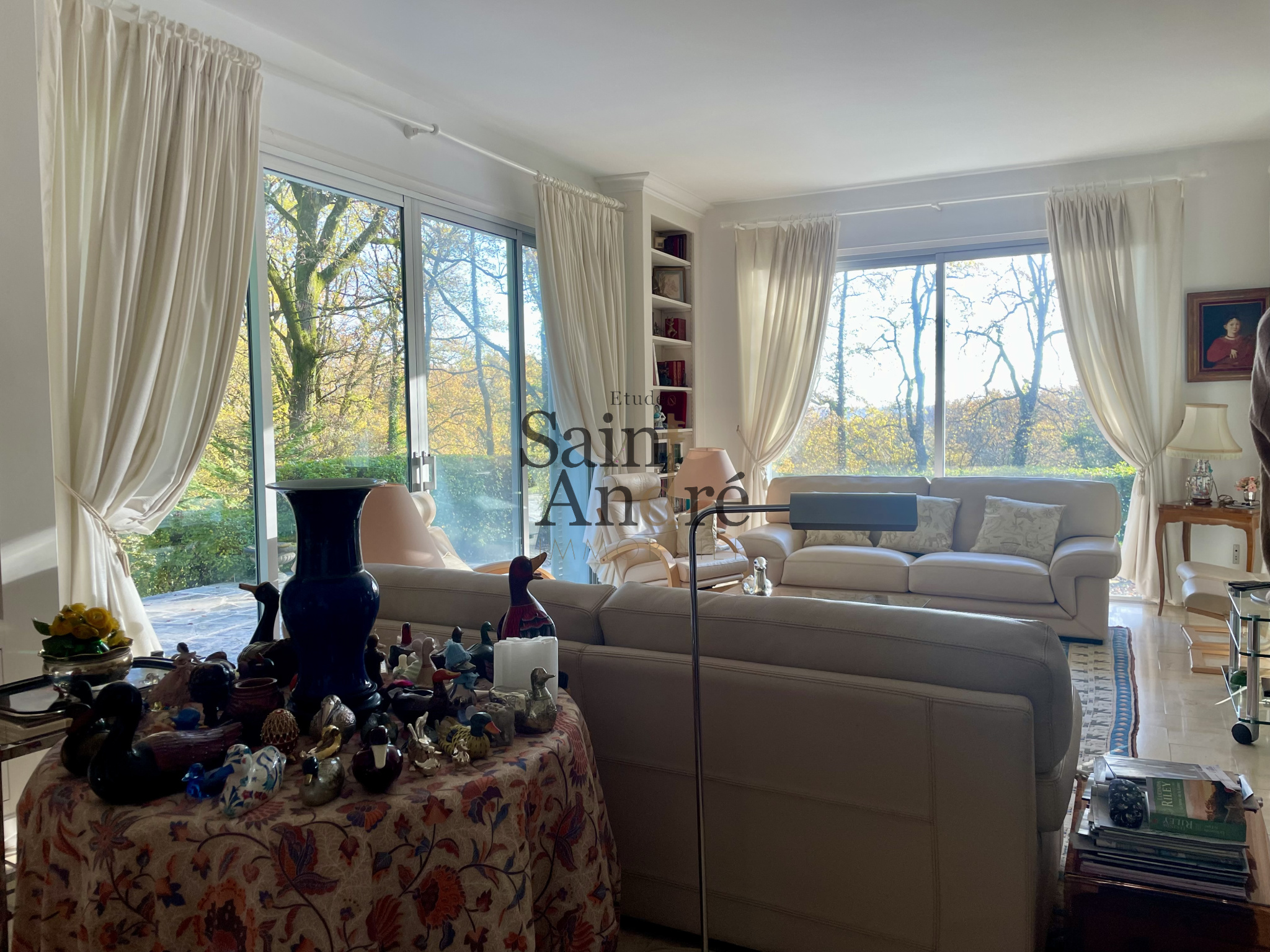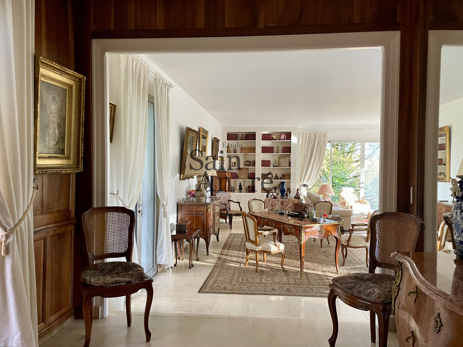 En interieur : Le Hall d'entrée paré de boiseries, s'ouvre sur un séjour exceptionnel d’environ 70 m², bénéficiant d’accès directs à une grande terrasse dominant la piscine chauffée (6 × 12 m) et offrant une vue dégagée sur les prairies et les bois environnants, 4chambres + 1 Suite principale ave SDB & dressing.